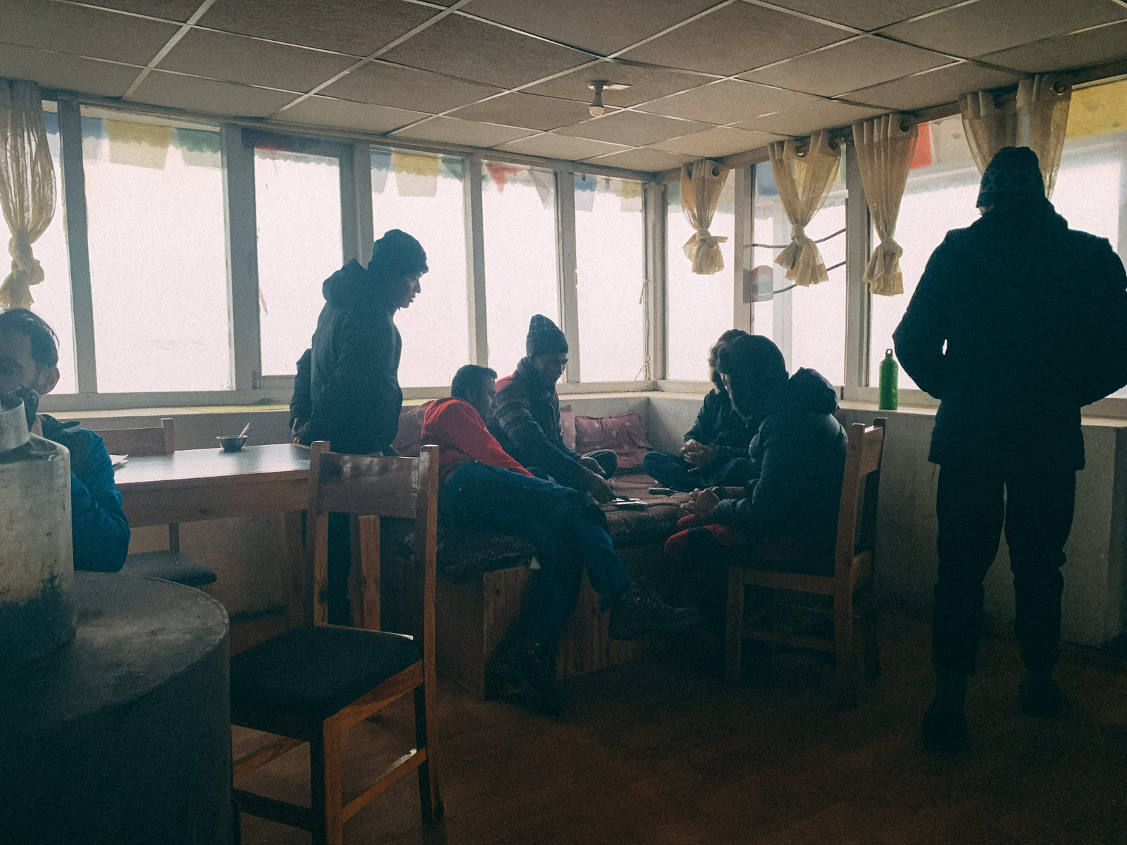 신라면으로 사기 충전 하고 레몬진저티로 마시고 다시 하이캠프를 향해 걷는다. 점심을 먹는 사이 아니나 다를까 날씨가 흐려지기 시작한다. 4월의 히말라야 날씨는 아침과 오전에 맑음 오후로 갈수록 구름 3-4시 정도에 비 올 거 같음 또는 갑자기 비. 빨리 걸어야 한다. 여기서 비가 오면 우비는 있지만 옷이 젖고 질척거려서 시간이 많이 걸린다. 그런데... 그런데.. 마르디 히말 능선은 정말 심장을 쫄깃하게 만든다. 구름으로 잘 보이지는 않지만 능선의 오른쪽은 절벽에 가깝다. 뒷사람 얼굴 보며 이야기하다가는 그냥 히말라야의 품에 안겨 집에 영영 돌아가지 못한다. 뭐 따로 휀스가 있는 것도 아니고 휀스가 있다 해도 유실된 것인지 있는 건지 없는 건지도 모를 정도이다. 급하게 마음을 먹고 빠르게 걷고 있는데 부슬비가 오기 시작한다. 이제는 우비를 입을 것인가 아니면 더 빨리 걸을 것인가를 결정해야 하는데 빠르게 걷기로 했다. 그리고 그 결정을 내리자마자 비가 오기 시작한다. 정말 빨리 걸었고 눈에 보이는 롯지에 무조건 들어가기로 했다. 하지만 첫 번째 두 번째 롯지에 방은 없었고 이미 웨스턴 친구들이 모두 방을 선점했다. 비를 맞으며 세 번째 롯지로 들어갔을 때 레스트캠프의 사우지(주인)을 만났다. 신기해하며 방이 있냐고 물었고 친절하게 방을 안내해 줬다. 방을 잡고 몸을 녹이기 위해 식당으로 갔고 사우지에게 언제 올라왔냐고 물어봤다!!! 사우지는 본인은 여기 계속 있었다며 휴대폰의 눈 온 롯지 맑은 날의 롯지 사진을 보여줬다. 그래서 레스트캠프의 사우지와 많이 닮았다고 이야기하니 친척이란다. 닮아도 많이 닮았다. 노름을 하던 네팔리 가이드들도 이스라엘에서 온 가족들도 모두 크게 웃었다. 사우지들은 얼굴이 다 똑같다며.