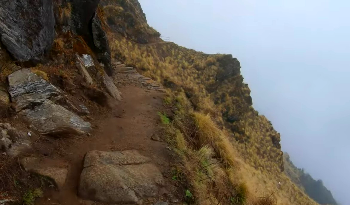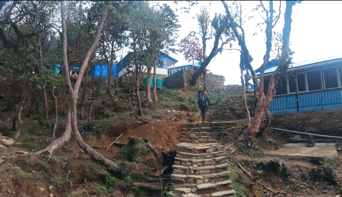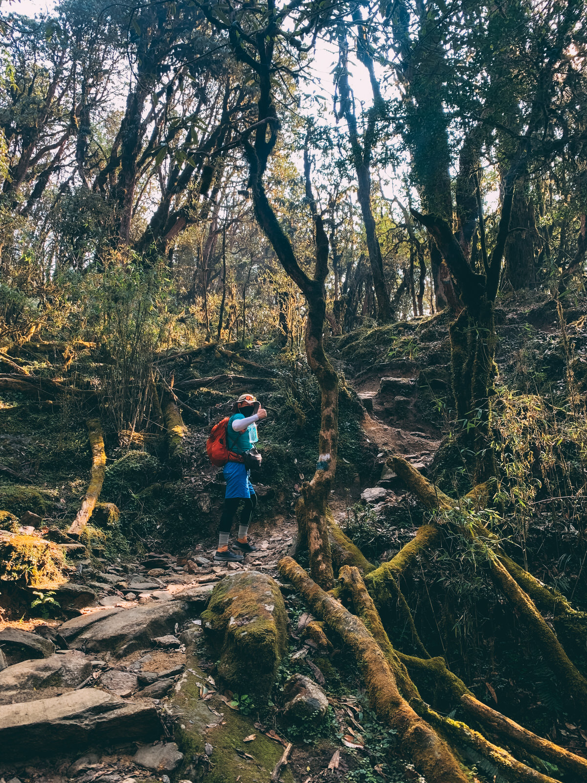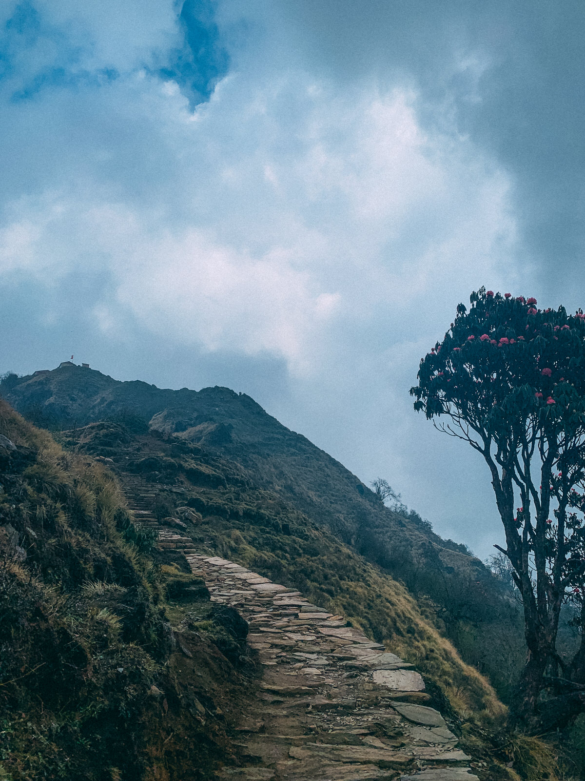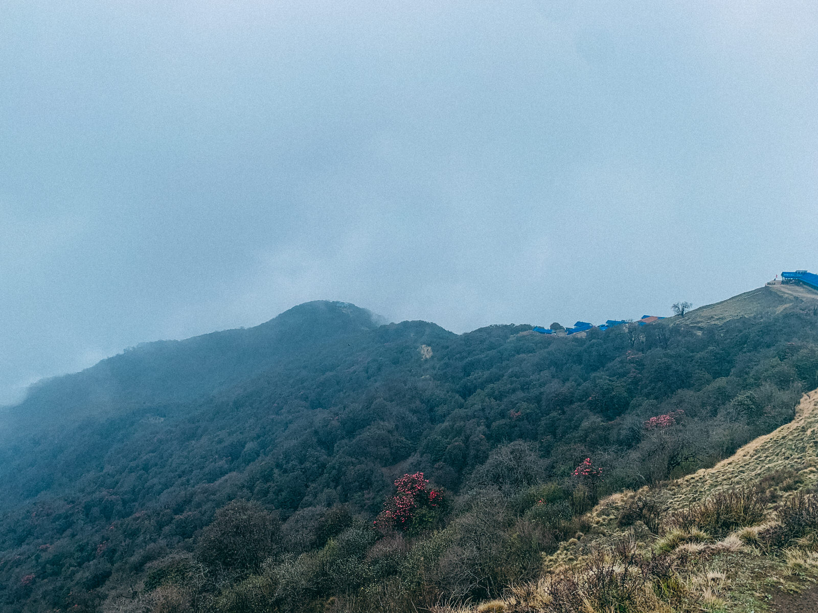 아침을 든든히 먹고 오늘의 목적지인 하이캠프를 향해 발 보다 빠른 배를 먼저 내밀어 본다. 시작은 오르막이 있는 숲길을 어제와 같이 계속 걷는다. 유튜브 영상에서 나오는 능선을 걷고 멀리 보이는 풍경은 숲길로 보이지 않던가 골짜기 가득한 안개? 구름? 때문에 보이지 않는다. 4월의 히말라야의 날씨는 덥다. 고지대가 아닌 이상 아니면 이른 아침 늦은 밤이 아니면 가을에 입는 등산복 정도로 입으면 충분하다. 오르막을 계속 오르다 보면 해발고도 2800m 정도에 Low Camp가 나온다. Middle Camp 가기 전 마지막 주유소 같은 느낌이니 여기서 레몬진저티도 한잔 마시고 담배도 피우고 잠시 쉬어간다. 그리고 이제 본격적으로 오르막을 오르고 또 오르면 바달단다가 보이는 오르막에 끝에 도착한다. 랄리구라스 군락지를 지나 보이는 바달단다 Middle Camp의 모습은 아름답지만 그냥 보이는 저곳이 High Camp였으면 하는 생각을 하게 만든다. 이제 다시 내리막길을 걸어 다시 오르막길을 오르고 또다시 계단을 지나 올라가고 내려가고를 반복한다. 숨이 턱까지 차오르고 돌아보니 지금까지 내가 걸어온 길들이 보인다. 그렇게 유튜브에서 봐왔던 능선에 도착을 한 것이다.