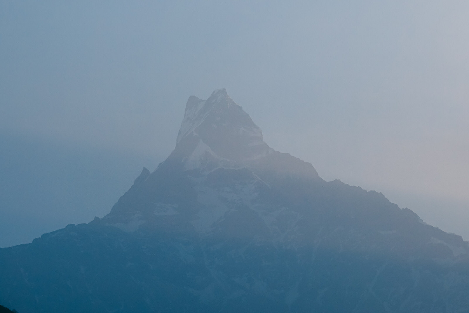 비로 인해 하이캠프를 가지 못하고 레스트 캠프에 멈추었다. 오랜만에 신라면을 먹고 기운을 차리고 푹 쉬었다. 히말라야는 걷는 것과 먹는 것 그리고 쉬는 것이 전부이다. 잘 쉬고 잘 자고 새로운 히말라야의 아침을 맞이한다. 4월의 히말라야 날씨는 아침이나 늦은 저녁이 가장 맑고 깨끗하다. 아침에 일어나서 커피를 한잔 마시고 있는데 가이드가 마당으로 나와 보라고 했다. 이제 일출이 시작된다고 했고 저 멀리 봉우리가 보이기 시작한다. 구름 낀 하늘이지만 일출과 함께 점점 명확해지는 모습이 보였다. 마차푸차레였다. 그동안 숲길을 지나며 멀리 보이는 풍경보다는 숲 속을 계속 걸어 나무만 보이는 길을 걸었는데 오늘 아침 마차푸차레를 직접 보게 된 것이다. 처음이었다. 뭔가 지쳐서 의미를 잃어가려고 하면 이렇게 잠깐 지친 나를 유혹하듯이 히말라야의 속살을 보여준다. 그러면 또 힘을 얻어 미친 듯이 목적지를 향해 올라가는 것이다.